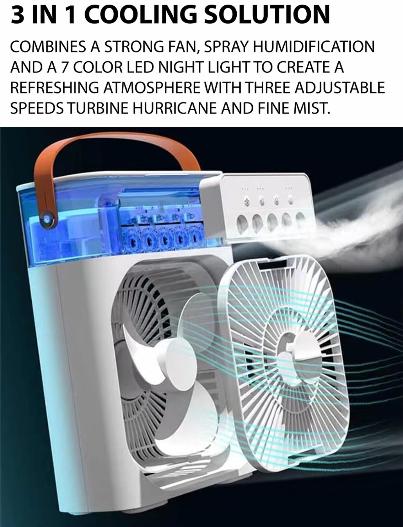Stay cool and comfortable anywhere with the Portable Air Conditioner Fan, a versatile 3-in-1 cooling solution designed for personal use at home, in the office, or on the go. This compact yet powerful device combines a strong fan, spray humidification, and a 7-color LED night light to create a refreshing atmosphere wherever you need it. Its three adjustable speeds – Turbine, Hurricane, and Fine Mist – allow you to customize the cooling experience to your preference.