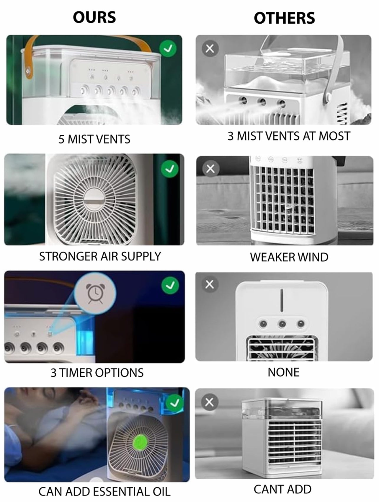 Compact and lightweight, this portable fan is easy to carry and perfect for use in bedrooms, offices, dorm rooms, or even camping trips. For optimal performance, make sure to use a power supply with an output current ≥2A and only fill the tank with tap or mineral water.